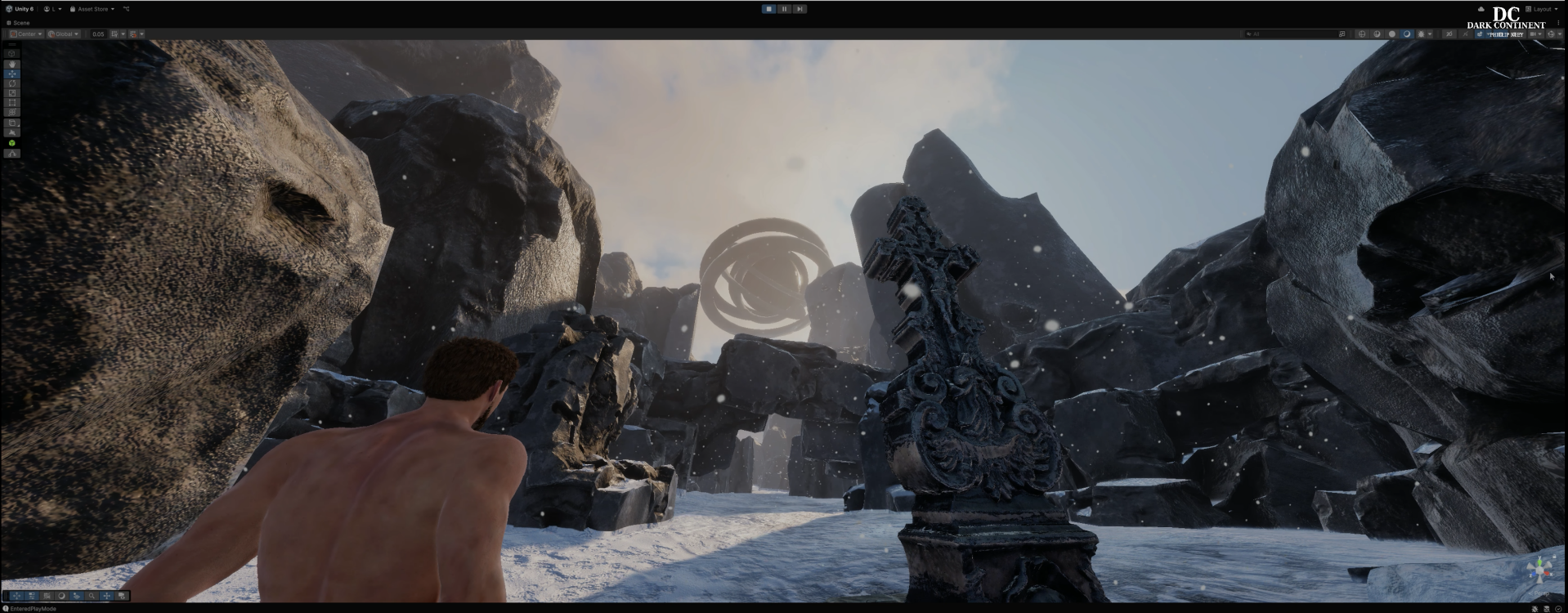 Ich arbeite derzeit intensiv am Ausbau der Gatebound Lands, die als zentrales Startgebiet des Spiels dienen. Das Gelände wird weiter detailliert aufgebaut – Wege, Felsformationen, Übergänge zwischen Innen- und Außenbereichen sowie Beleuchtung und Nebel werden schrittweise verfeinert. Ziel ist es, dass dieser Bereich später den vollständigen Einstiegspunkt des Spiels bildet und alle Grundsysteme dort zusammenlaufen.