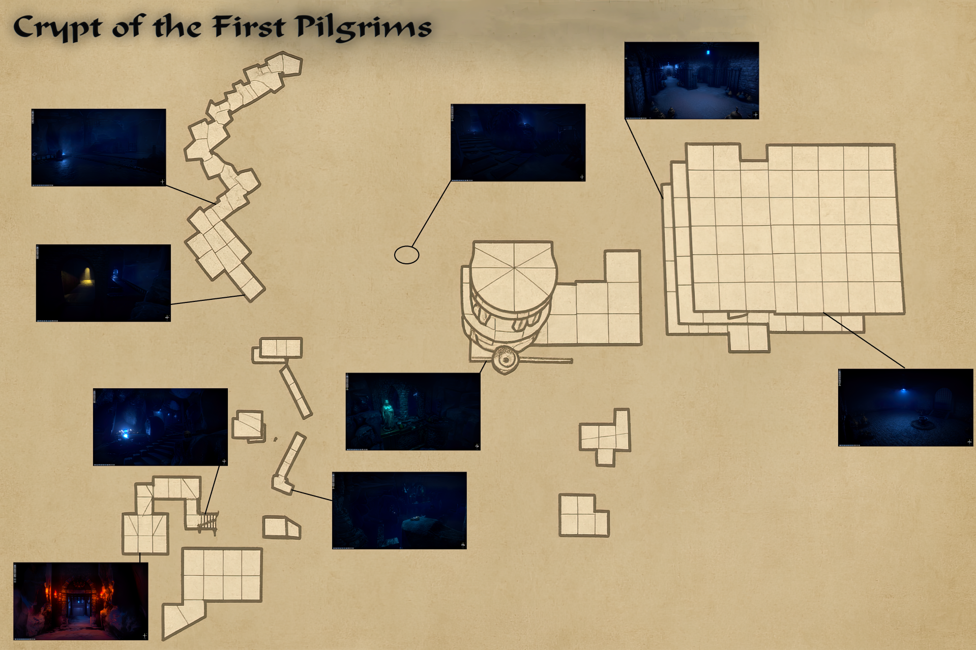 Beim Aufbau habe ich mich an dem orientiert, was diese Art Dungeon stark macht: ein klarer, merkbarer Fortschritt, sinnvolle Abkürzungen und Rückwege, ein Wechsel aus engen Passagen und großen Räumen, plus Landmarken, die sich im Kopf festsetzen. Die Krypta soll sich nicht wie ein gerader Korridor anfühlen, sondern wie ein Ort, den man mit jedem Schritt besser versteht. Nicht durch Karten oder Marker, sondern durch Architektur, Blickachsen und Licht.