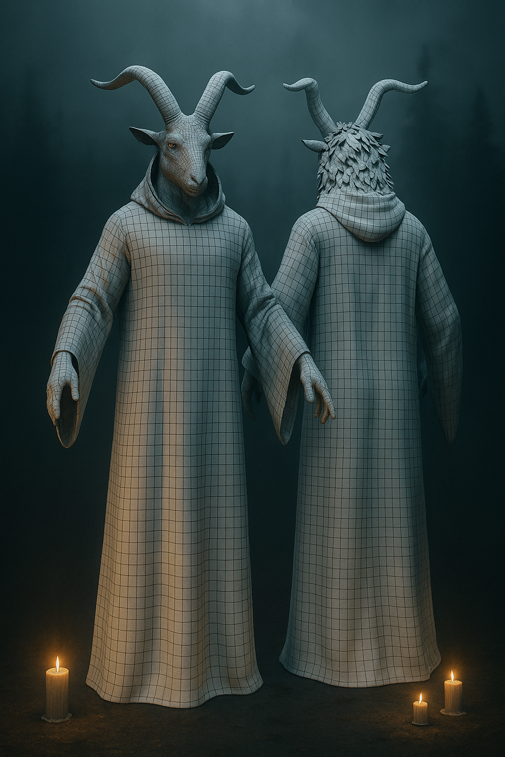 They speak of a wanderer who went north for warmth and found a flame that cannot warm. Since that night he drifts a hand’s breadth above the ice, horns like shadows in the snow. In a whiteout he is gone. Only red eyes remain, and the pale-gold shimmer of his Hollow Flame grants no solace. From afar it steals the breath, long before the mind names it. Some say he does not hunt, only searches for the way back, yet every step unwrites the last, and the snow falls quieter where he passes.